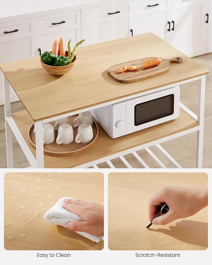 VASAGLE Kitchen Island with 3 Shelves, 39.4 Inches Width Kitchen Shelf with Large Worktop, Stable Steel Structure, Industrial, Easy to Assemble, Oak Color and White UKKI005W09