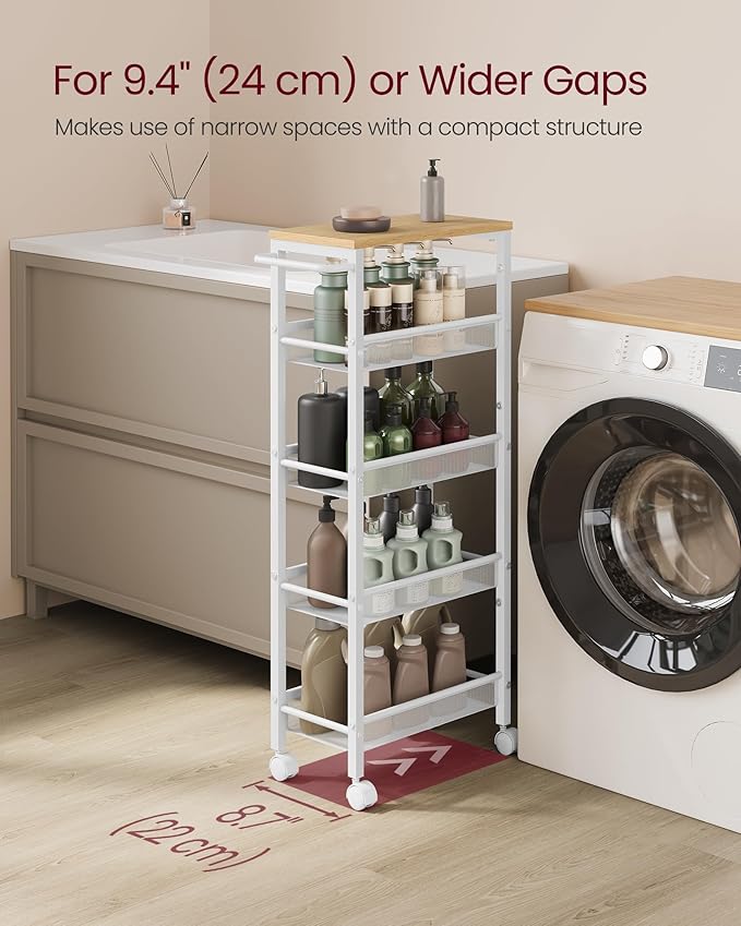VASAGLE Slim Rolling Cart, 5-Tier Storage Cart, Narrow Cart with Handle, 8.7 Inches Deep, Metal Frame, for Kitchen, Dining Room, Living Room, Home Office, Oak Beige and Classic White ULRC035W09