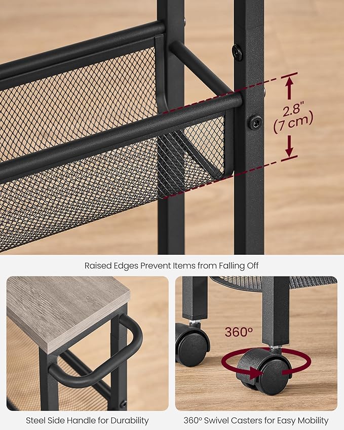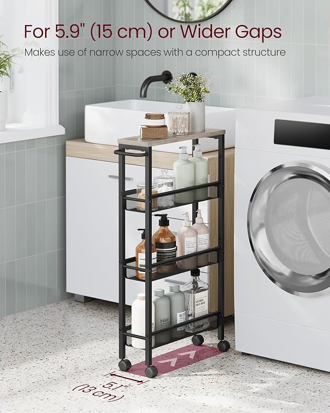 VASAGLE Slim Rolling Cart, 4-Tier Storage Cart, Narrow Cart with Handle, 5.1 Inches Deep, Metal Frame, for Kitchen, Dining Room, Living Room, Home Office, Heather Greige and Classic Black ULRC032K01